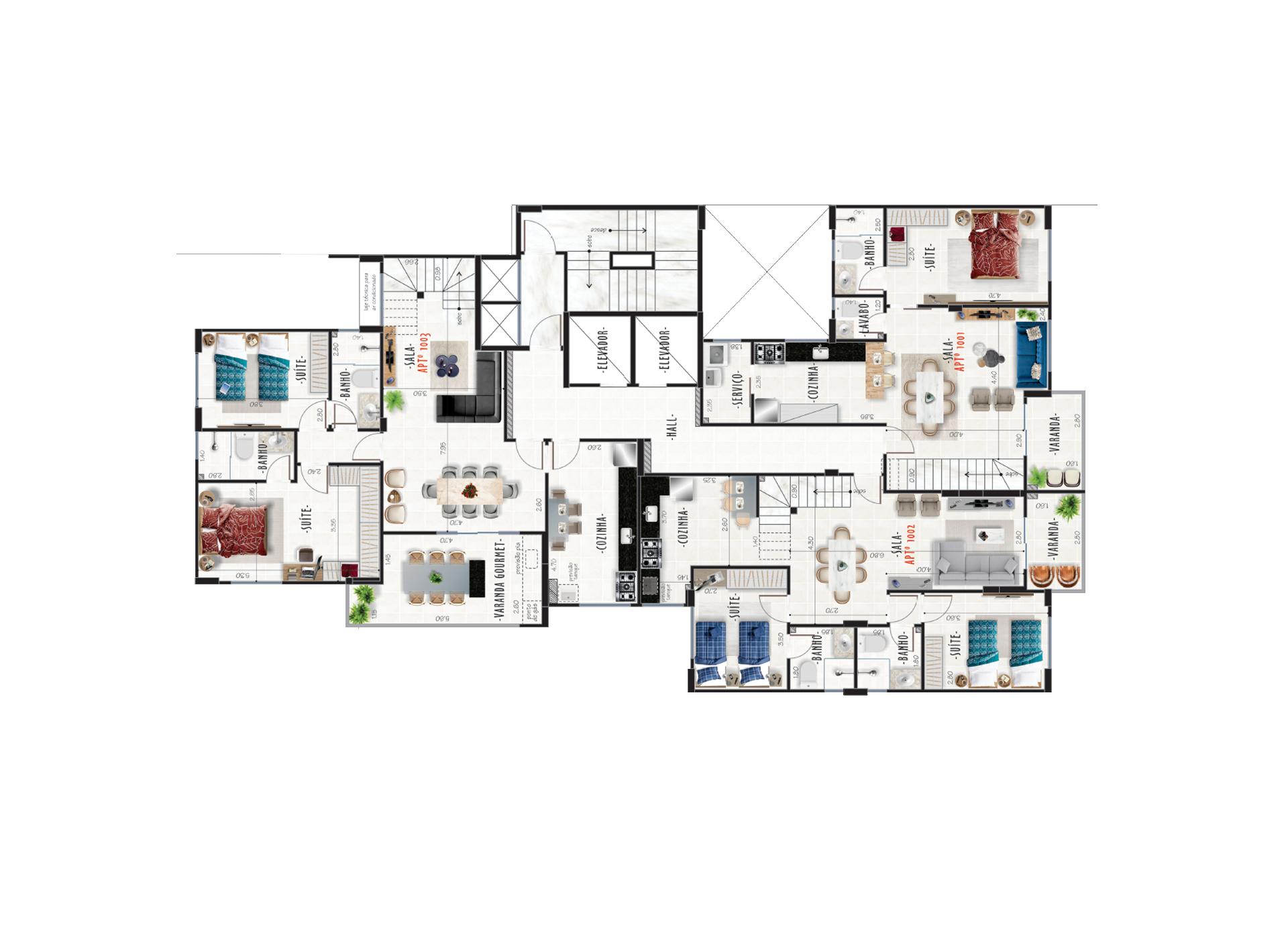 Opções em 02 quartos com 01 ou 02 suítes, ou 03 suítes.
